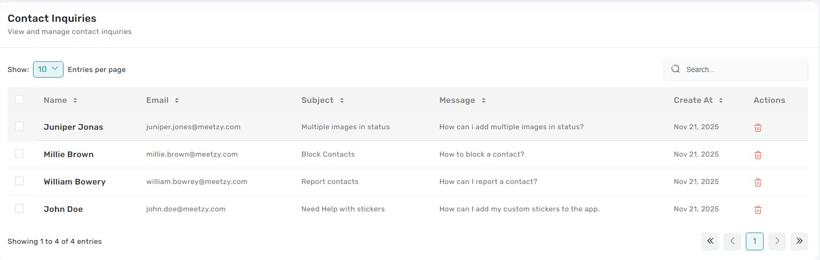The Contact Inquiries table captures every message submitted through Meetzy’s public contact forms, showing requester name, email, subject, priority, status, and received date. Clicking a row opens a drawer with the full message body, attachments, and interaction history so Super Admins can respond or escalate without leaving the list.