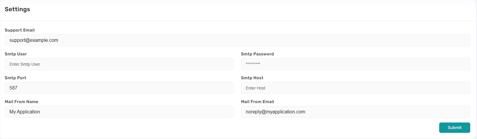 A dedicated settings page presented as a form showing SMTP host, port, username, password (masked), support/from addresses, and display names. Fields are pre-populated from current settings fetched via the API so admins see the latest configuration.