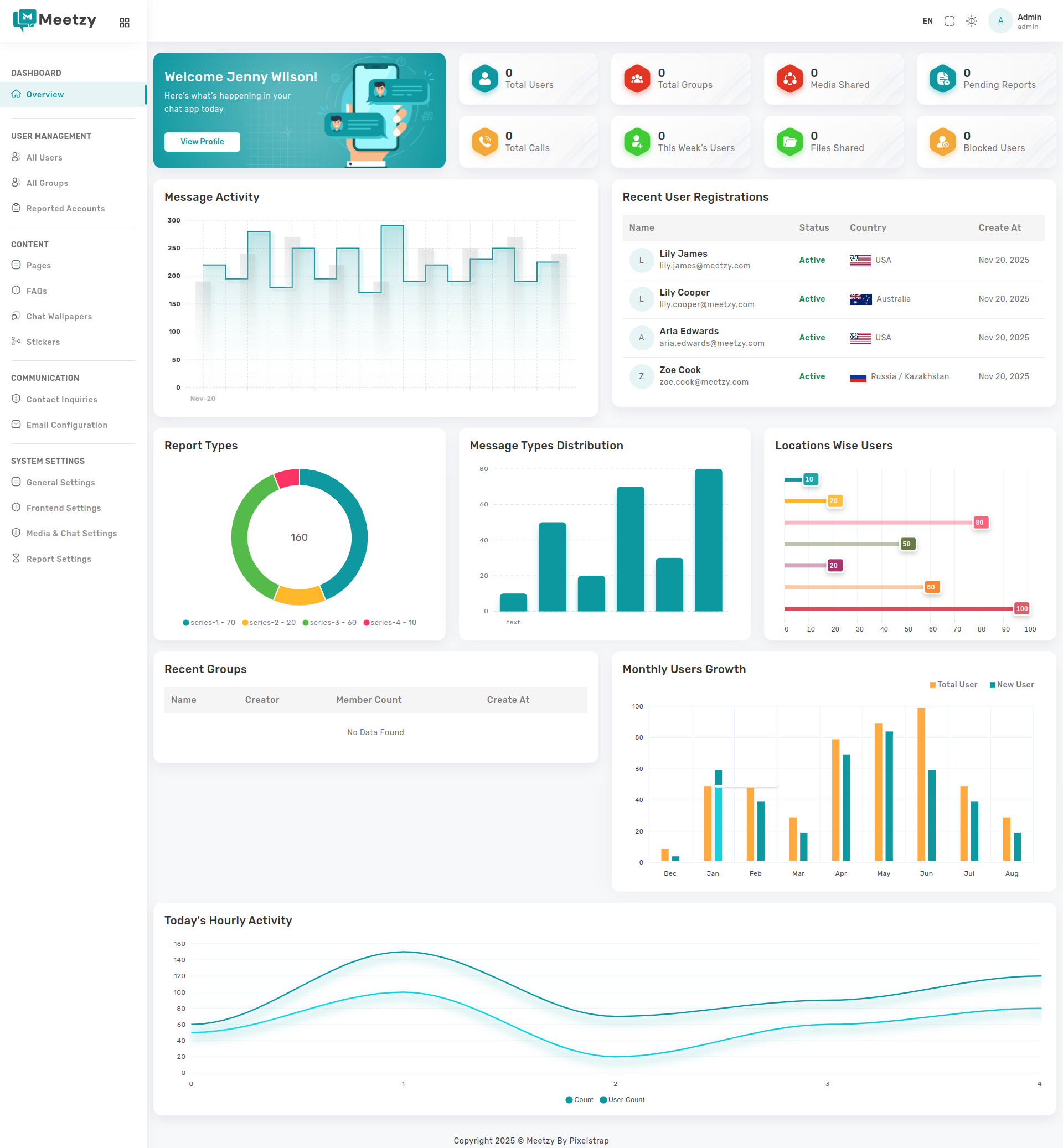 As the core of platform administration, the Meetzy Super Admin leverages its integrated Dashboard, User Management, Page Management, FAQ Management, Chat wallpaper Management, Sticker Management,Communication Module and System Settings modules to deliver end-to-end control and real-time insights across the entire Meetzy ecosystem.