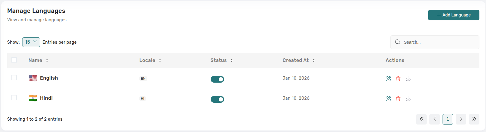 The Manage Languages page allows administrators to configure and control the available languages in the chat application. Admins can add new languages, enable or disable existing ones using toggle switches, and manage language settings including locale codes and creation dates. This centralized interface provides full control over the multilingual capabilities of the platform, ensuring users can communicate in their preferred languages.
