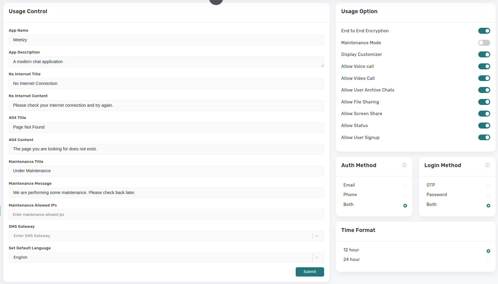 The General Settings page combines branding/content controls with operational toggles. A two-column layout shows a form for text fields (app name, descriptions, offline/maintenance copy, allowed IPs) and a switchboard for feature flags (maintenance mode, customizer visibility, audio/video calls, archive/media permissions).