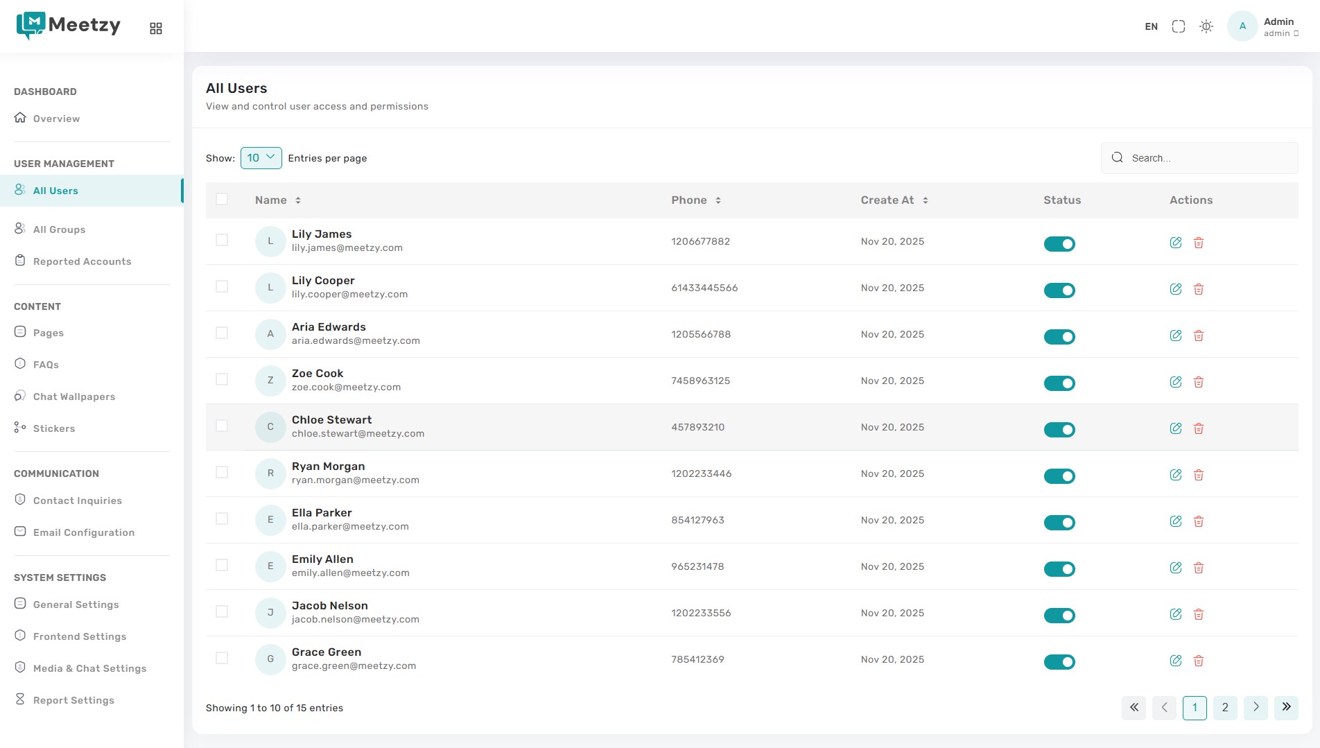 Edit: Routes to the user form where admins can update names, phone numbers, roles, feature flags, and avatar (email remains read-only). Saving writes changes instantly and returns to the table.