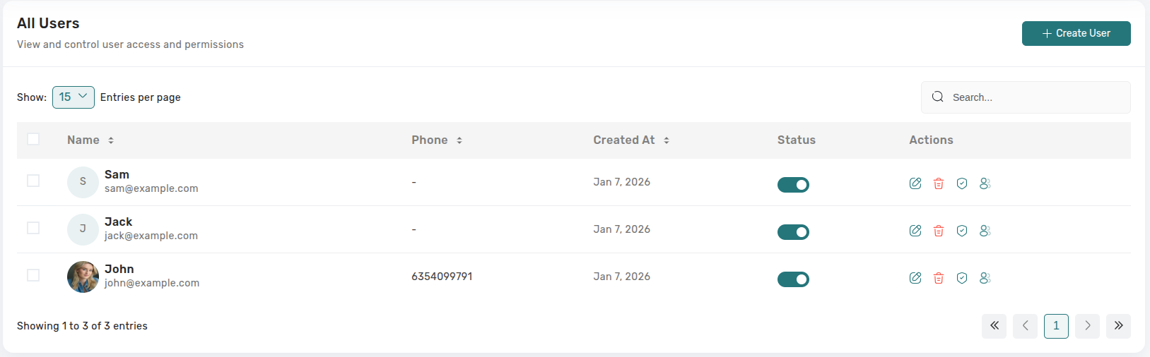 Status Toggle: Clicking the active/inactive switch opens a confirmation prompt; once confirmed, access changes immediately and a toast confirms success.