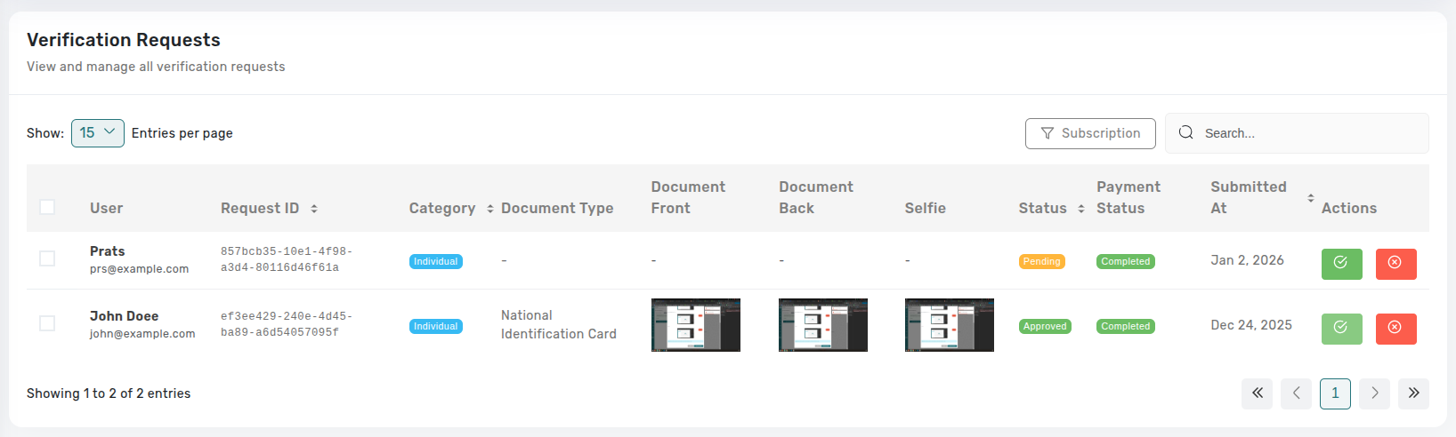 The Verification Requests module enables administrators to manage user verification requests by reviewing documents, validating payments, and approving or rejecting requests from multiple sources.