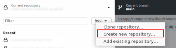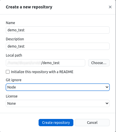 After click create new repository one pop-up will appear in the form add your project name your project path where it is located and click on Create repository button