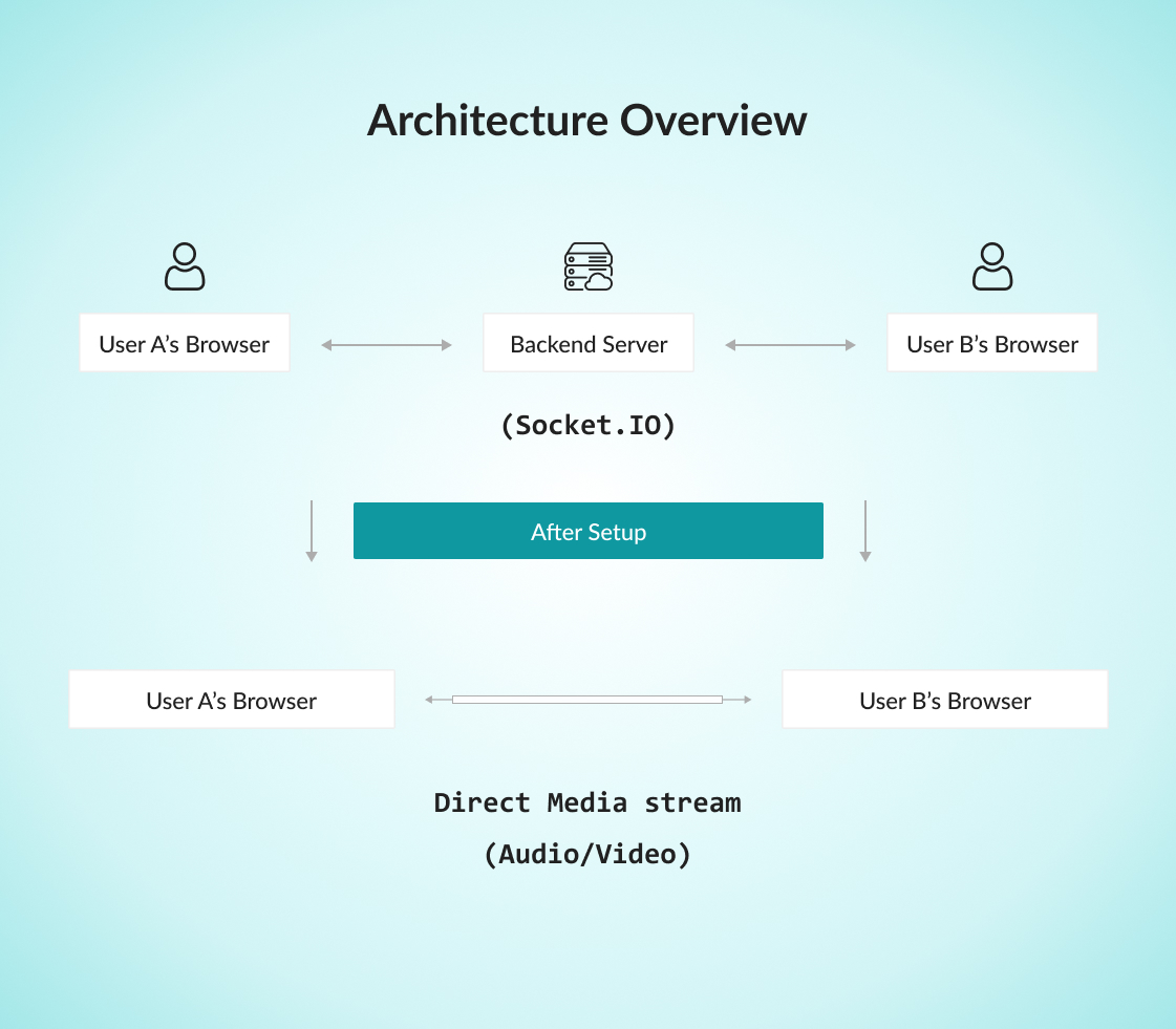 Signaling: Exchange of setup info (offers, answers, and ICE candidates) via Socket.IO before establishing the direct link.